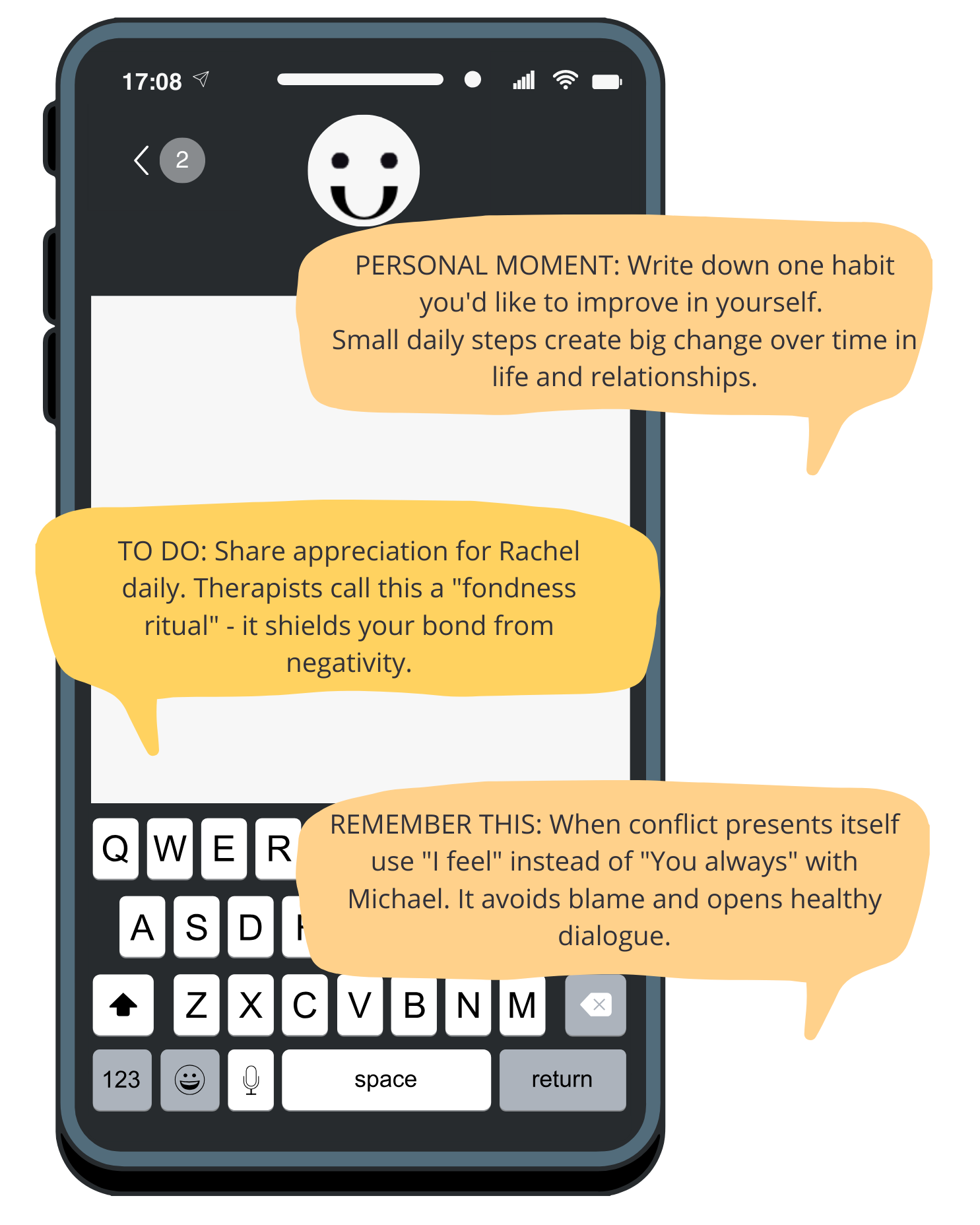 Prompts, reflections, evening/ morning actions, conflict-resolution tips, mini games, and more tailored just to you, so it always feels fresh.